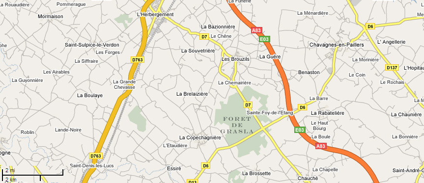 Car rental: Avis and Hertz both have offices in Nantes and in La Roche-sur-Yon. (In La Roche, the more convenient location, they are both located opposite the train station.) To reach Les Brouzils from La Roche, follow signs for Nantes and Montaigu onto the D-763 and look for the exit marked l�Herbergement and Les Brouzils. From Nantes, take Autoroute A-83 toward La Roche sur Yon, exit at Montaigu and follow signs for l�Herbergement, then Les Brouzils. Click here for a Google itinerary from La Roche, or here for an itinerary from Nantes.